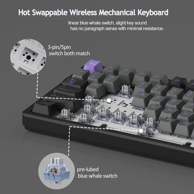 [HOT SWAPPABLE PREBUILT CUSTOM SWITCH]: Quiet linear blue whale switch, support 3/5 pin switch, the switches are individually removable and can be replaced without soldering issue, slight key sound has no paragraph sense with minimal resistance, makes it easier to tap the keyboard.