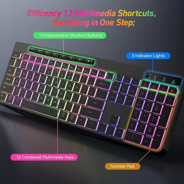 Compact Full-size 104-Keys, 12 Independent Shortcut KeysWith Standard US QWERTY layout and 12 independent shortcut keys, EarlyLit wireless keyboard makes working more efficient, and each key on the number pad is well-spaced, greatly avoiding pressing the wrong key. The foldable stand behind the keyboard provides a comfortable typing angle for you, so you can enjoy comfortable typing for hours