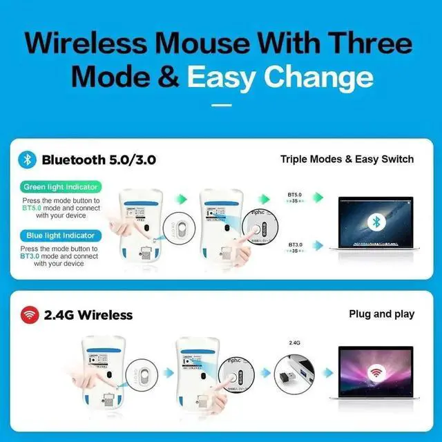 Upgraded 3-mode BT 5.0 /BT 3.0 / 2.4G Wireless Mouse- One mouse works on Three devices simultaneously
