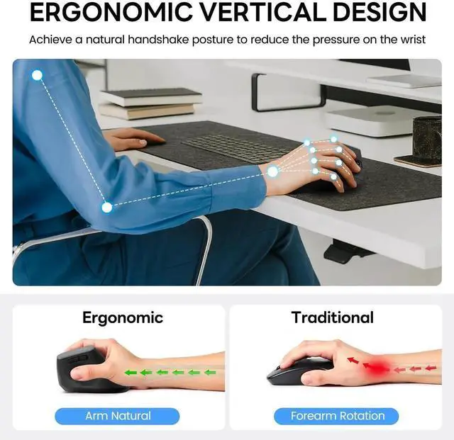 Uineer Ergonomic Wireless Mouse, Bluetooth Vertical Mouse with BT 5.0 / 4.0 / 2.4G, Rechargeable with Battery Indicator, Ergonomic Design for Comfort and Reduced Wrist Strain for Home, Office Use, Black