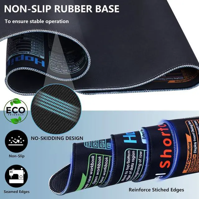 Smooth Surface & Non-slip BaseExperience smooth and precise mouse control with our excel shortcut keyboard mat. Featuring an ultra-smooth surface, it allows for effortless movement and accurate tracking. The desk mouse pad kit' s non-slip rubber base holds the pad securely in place, preventing the office desk mat for desktop from slipping during intense gaming or fast-paced work.