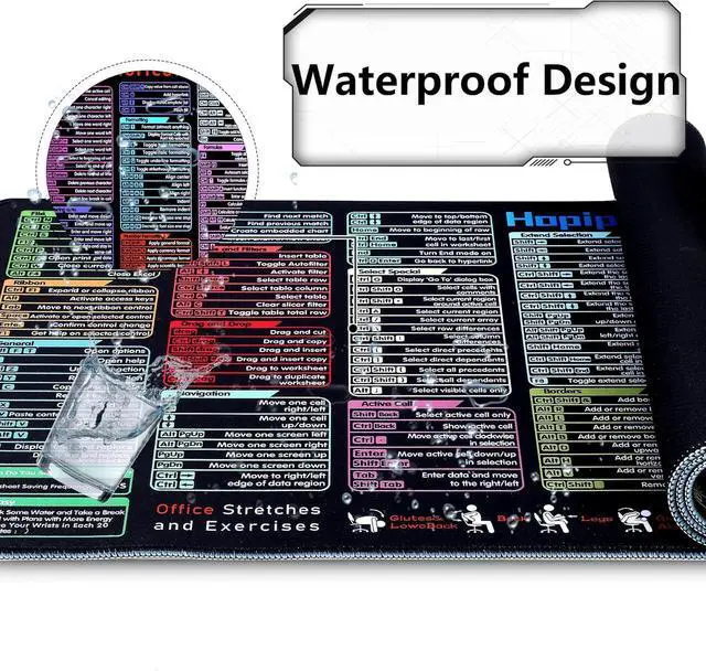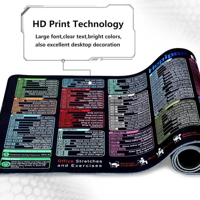 HD PrintingThe extra large excel cheat sheet desk pad adopts high-tech printing technology to ensure clear patterns and bright colors. With quick access to vital Excel shortcuts and guided stretching exercises, the Hopipad Shortcut Mouse Pad keeps you sharp and relaxed, making it the perfect office accessories for any busy professional.