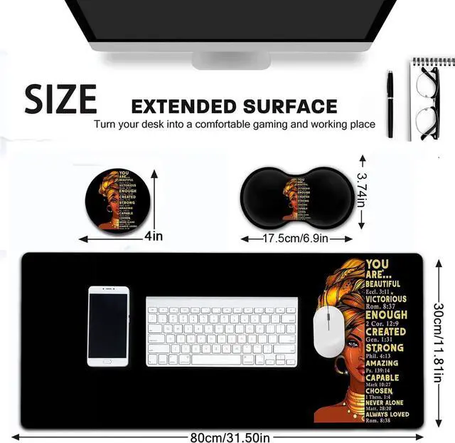 Extended Large Mouse Pad Size: 1 x mouse wrist support, 1 x quality coasters. 1 x Desk pad measures 31.5 x 11.8 in, ultra large size for optimal gaming. Besides, you can also use this extended mouse pad as a desk pad, writing pad, platform protection mat. Keep your desk clean and uncluttered.