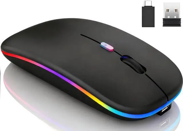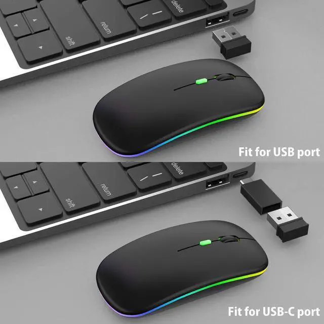 7 Colorful LED breathing light change alternately, soothing light lights up the mouse in dark, adds more fun to the life. Note: It can't be set to one specific color. How to use it? * Charge the mouse for about 2 hours before using it for the first time. 1. Take the dongle out, which is stored at the bottom of the mouse. 2. Insert the dongle into the USB port of your device, and open the mouse switch (at the bottom of the mouse). 3. Allow a few seconds for installing, no action needed, just wait. Then you can use it. Note: If your computer is Type-C port, please insert the USB-C to USB receiver into the Type-c port of the device first, then insert the USB receiver into the USB-C to USB receiver. Turn on the power switch and the mouse will work. Tips: The mouse cursor will move slowly or stop moving when the mouse is low battery. Please charge it on time. The blue light beside the scroll wheel will be on while charging, and then goes off when the mouse is fully charged.
