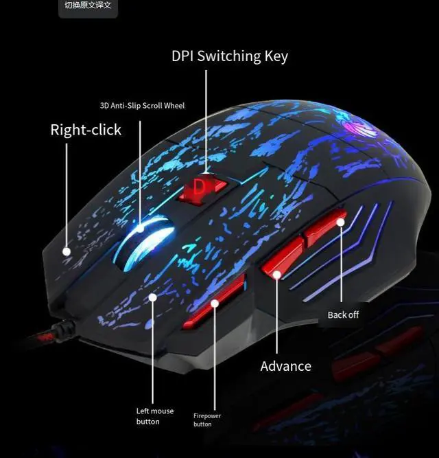 USB version:2.0Buttons: Left, Right, Scroll Wheel, DPI, Fire Button, Forward, Retreat.Light effect: Multi-color glowingCompatibility: Supported for Windows 7/8/2000/XP/Vista, Mac OS or newer versions.Color: Black + Red