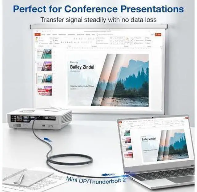 Mini DP 1.4 to HDMI 2.1 Cable This Mini DisplayPort (thunderbolt 2) to HDMI cable allows you to connect laptops with Mini DP ports to external displays/TVs/Projectors with HDMI, which works beautifully whether you are planning to give presentations, or watch UHD videos with your laptop on a bigger screen.
