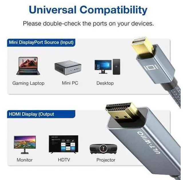 Note: It only transfers signal from mini DP to HDMI, NOT HDMI to mini DP. 8K@60Hz Ultra High-Def Unlike others that only support 4K or even 1080P, the Mini DisplayPort male to HDMI male cord supports resolutions up to 8K (7680x4320) video at a high 60Hz refresh rate. And backward compatible with 4K@120Hz, 2K@240Hz/165Hz/144Hz, 1080P@240Hz. It's ideal to get the most out of your Surface Pro or MacBook. Functions Like No Other It almost follows the HDMI 2.1 standard. And compared with other Mini DP to HDMI, this is a whole new feature upgrade, not only can reach 8K@60Hz, but also support VRR, AMD FreeSync, Dynamic HDR, Dolby 7.1, 3D, BT. 2020, 10bit color depth, DSC 1.2 a for outstanding image and fast response in the gaming world. Top-Notch Design & QualityFeaturing corrosion-resistant 24K gold-plated connectors, aluminum alloy shell and quality nylon braided jacket improve the signal performance, guarantee stable transmission so as to provide superb quality audio and video (AV). Slim shell size frees you from the worry of getting in the way of nearby ports.
