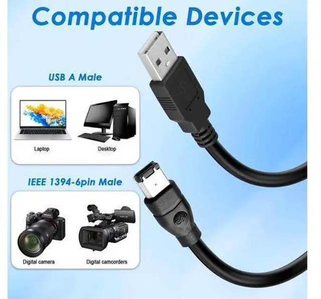 • One end is IEEE 1394 Firewire 6-pin male and other end is USB male connector, supports Plug-and-Play connection, easy to use, it is a dedicated cable for 6-pin firewire devices connected to compouter.