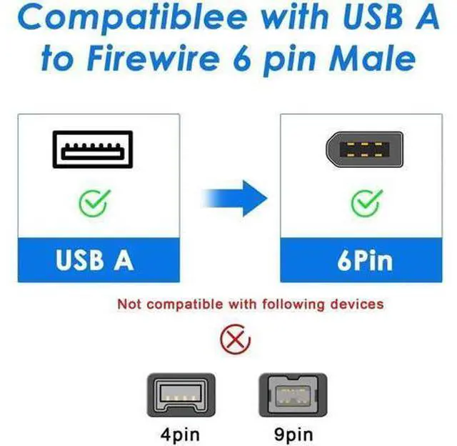 Herfair 6-Pin IEEE 1394-a Firewire 400 to USB 2.0 A Adapter Cable Scope of application: Early Mini DV & D8 cameras, digital camcorders, digital cameras, printers, scanners, external hard drivers, old MOTU audio converters, sound cards, PC (with Firewire 400 card), old old Mac/Mac Mini, 2001 Powerbook G4 and other devices with IEEE 1394-a 6-pin female ports. (please note that some of the 6-pin port only supports charging function, so please make sure yours support data function or this product will not work)