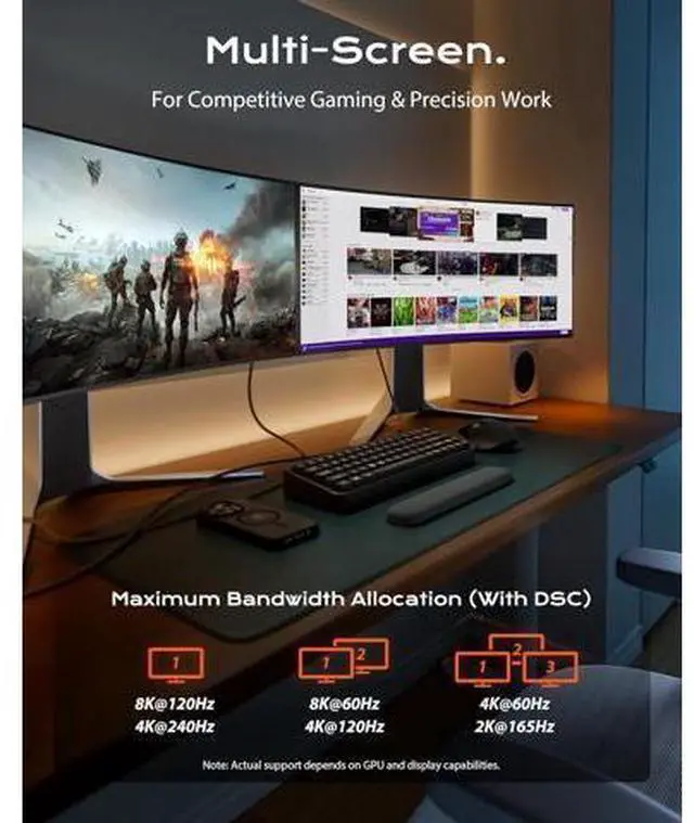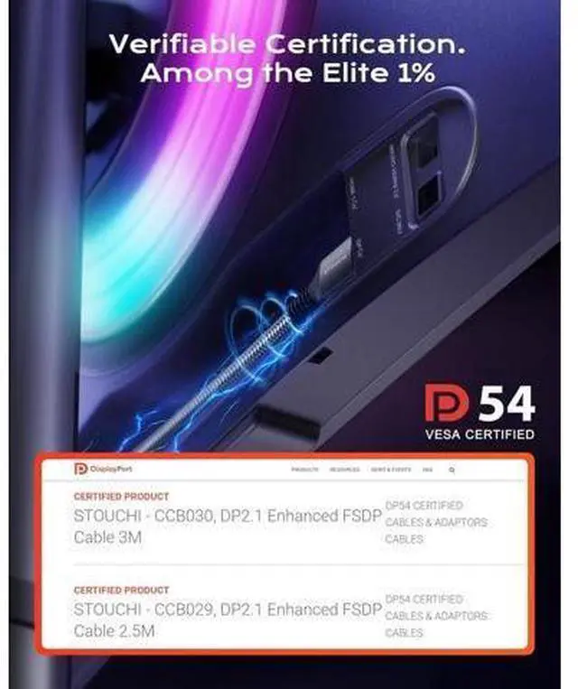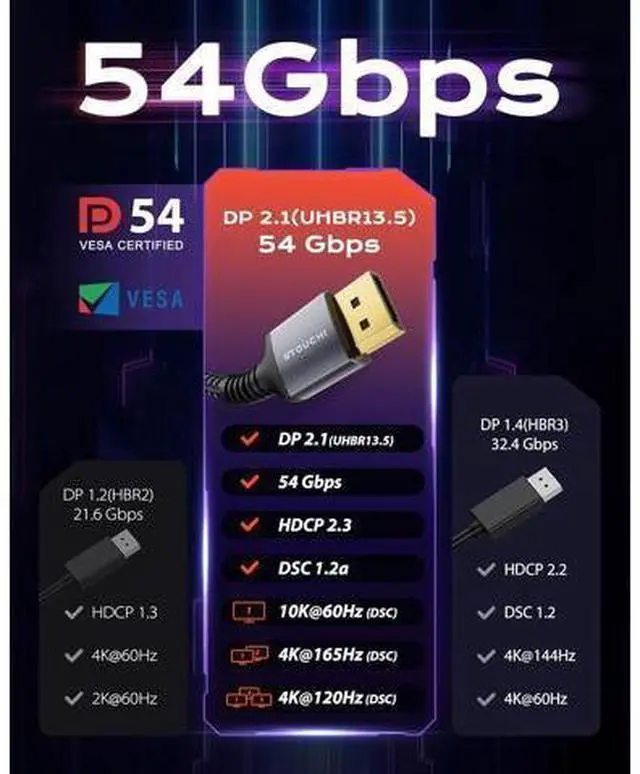 [Official VESA Certified UHBR 13.5 ] This cable is Official VESA Certified to ensure a verified 54Gbps bandwidth significantly outperforming standard DP 1.4 cables. It is specifically optimized for RX 7000 RTX 50 Series and next-gen 8K monitors. Validated through rigorous lab testing it delivers uncompressed visual fidelity and stable high-refresh rates (4K@240Hz / 2K@360Hz) without the signal drops or handshake issues found in non-certified alternatives[Triple-Layer Shielding & 28AWG Core] Built for interference-free stability. We use a thick 28AWG Oxygen-Free Copper core wrapped in triple-layer shielding (Nylon Braid + Aluminum Foil + Metal Braiding). Heavy-duty construction is 10x more abrasion-resistant than cheap PVC cables and completely isolates the signal from power cord EMI/RFI interference.