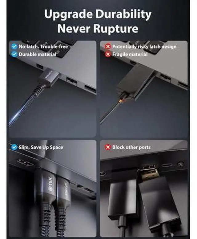 Result: Zero flicker and zero static even in complex cable management setups packed with other devices[Ultimate Gaming Fluidity & Durability] Experience the true potential of your high-end rig. Supports G-Sync FreeSync Premium Pro and Dynamic HDR without stutter. The reinforced joint design is lab-tested to withstand 10 000+ plug/unplug cycles and extreme bending. Whether you are playing competitive FPS at 360Hz or editing 8K video this cable delivers the raw speed and physical resilience your setup deserves[Snag-Free Protection & Reinforced SR Design] Engineered for real-world gaming. We replaced the risky locking latch with a precision friction-fit (Snag-Free) designit secures firmly to prevent disconnects from desk bumps yet unplugs safely without damaging GPU ports. The connector features heavy-duty SR strain relief to resist bending wear and a standard-profile Aluminum-Alloy housing ensuring it seats perfectly in tight MATX cases without blocking adjacent ports[Plug-&-Play Compatibility Works with Your Old Rig and New Build] No driver fuss no no signal panics. Compatible with DP 1.4 / 1.2 / 1.1 so it plays nice with your decade-old laptop and future 8K monitor. Tested with GPUs from RTX 4090 to 1070 and screens from G9 to standard 1440p displays.