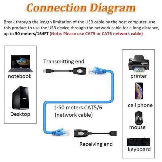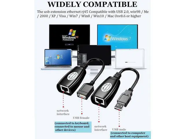 USB Extender Over RJ45 Ethernet Cat 5/6 Extend the USB interface of the computer host up to 50 meters through a single CAT5 or CAT6 network cable, breaking the length limit of the computer host on the USB cable. Plug and Play ethernet usb female No power required, no external power source is required, more convenient connection. Widely Compatible Widely Used for use with USB cameras, printers, web cams, keyboard, mouse extensions, Compatible with USB 2.0, win98 / Me / 2000 / XP / Visa / Win7 / Win8 / Win10 / Mac Osv 8.6 or higher.