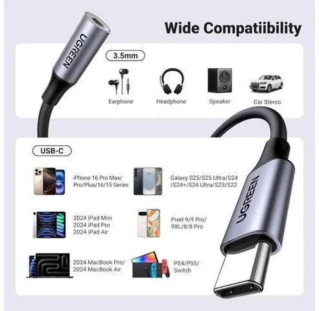 Widely Compatibility with USB C Devices and 3.5 mm Headphones For Galaxy Galaxy S25/S25+/S25 Ultra/S24/S24+/S24 Ultra/S23 Ultra/S23/S23+/S22/S22+/S22 Ultra/S21/S21+/S21 Ultra/S20 Ultra/S20+/S20/A14/Tab S9/S8/S6/S5e For iPhone iPhone 16 Pro Max/16 Pro/16 Plus/16/15 Pro Max/15 Pro/15 Plus/15 For Google Pixel 9 Pro XL/9/9 Pro/8/8 Pro/7/7 Pro/6/Pixel 6 Pro For iPad iPad 10, iPad min 6, iPad Pro 2024/2022/2021/2020/2018, iPad Air 6/5/4 For OnePlus 10/10 Pro/ 9/9 Pro/8 Pro/8/7T Pro/7T/7 Pro/Nord 2/ Nord For MacBook MacBook Pro 2023/2022/2021/2020/2019, MacBook Air 2022/2021/2020/2019, iMac 2021 M1 3.5 mm Devices Headphones/earphones/headsets; Car Radio System, especially cars with no Bluetooth; Speaker /Amplifier / Hi-Fi system