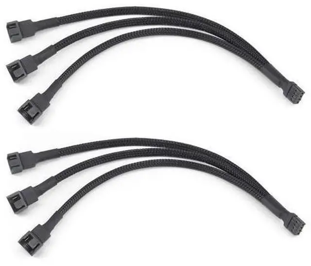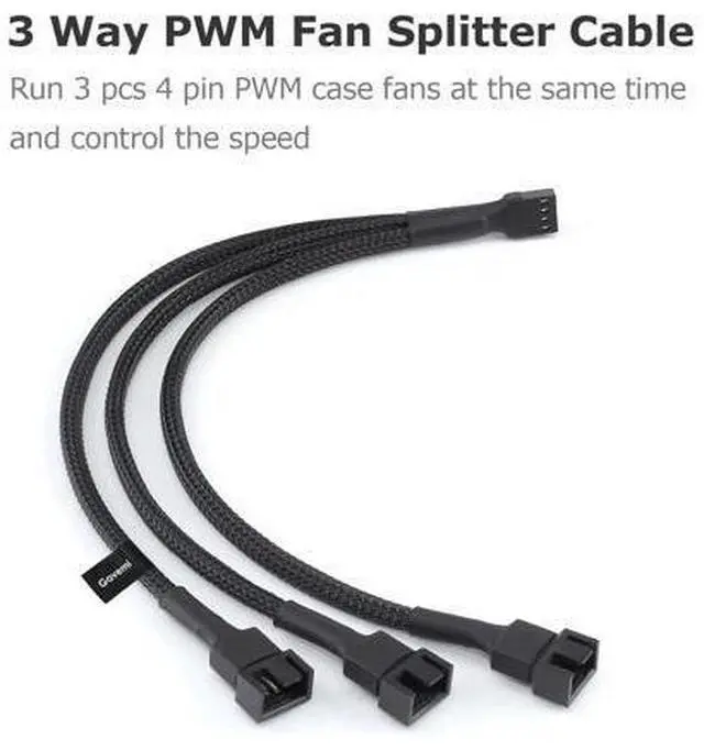 PWM Fan Splitter works with all brands of 4 pin and 3 pin connector PC case cooling fans. Fan splitter is a black cable sleeve to make the inside of the case more concise. 2- Pack pwm fan splitter cableLength 12 inches, 24 AWG pure copper conductor.