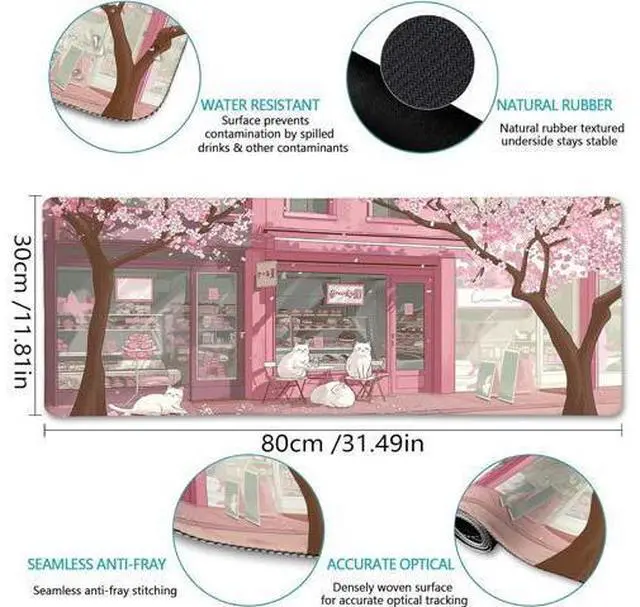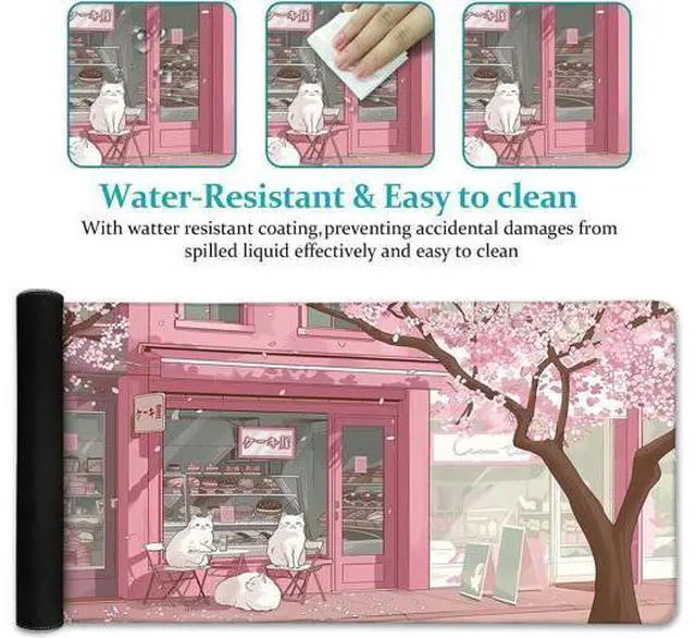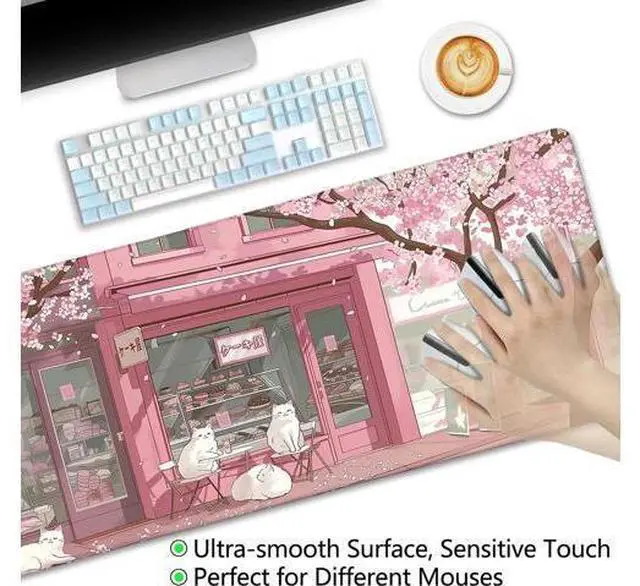 Playful Design: The anime cat desk mat features an adorable design of white cats lounging under cherry blossom trees outside a Japanese dessert house. This feminine and cute design adds a touch of charm to your workspace Extra Large