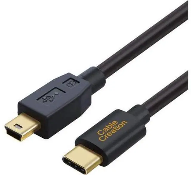 USB C to Mini USB cable connects a computer with a Type-C USB port to legacy USB peripheral device with a Mini B USB port for syncing and charging.