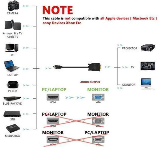 VGA output format: 480i/ 576i/ 480p/ 576p/ 720p/ 1080i/ 1080p/ 60HZ. Support HDMI 1.1 / 1.2 / 1.3 HDCP 1.0 / 1.1 / 1.2.? HIGH-END DESIGN - Gold-plated connector provide rigidity protection and excellent transmission performance; This HDMI cable is made of heavy duty material high quality.??? NOTE - This cable is?? NOT compatible with all devices [ Macbook Etc] PS2/3 Etc and Xbox Etc; This is not a bi-directional adapter cable?? can not go from VGA to HDMI so you won t be able to use this in reverse.