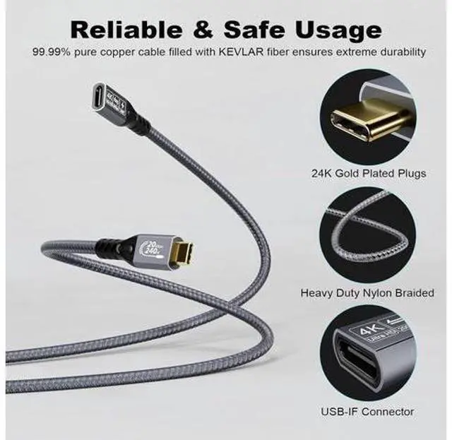 20Gbps USB C 3.2 Extension CableUSBC 3.2 Gen2 20G 240W Ultra 4K Video. This USB 3.2 male to female cable allows you to connect your laptops with USB-C port (DP Alternate Mode for video supported) to your external monitors with USB-C port, you need to connect an external USB 3.2 male/male cable to connecting to your computers laptops or displays, USB-C 3.2 M/M cable is not included in our package. 240W PD ProtectionUSBC charger cord supports PD 3.1 and QC 4.0 fast charging, up to 50V/5A (max) with USB-C power delivery adapters including various 240W 100W 96W 87W 61W 60W 30W 18W 15W USB-C wall adapters.