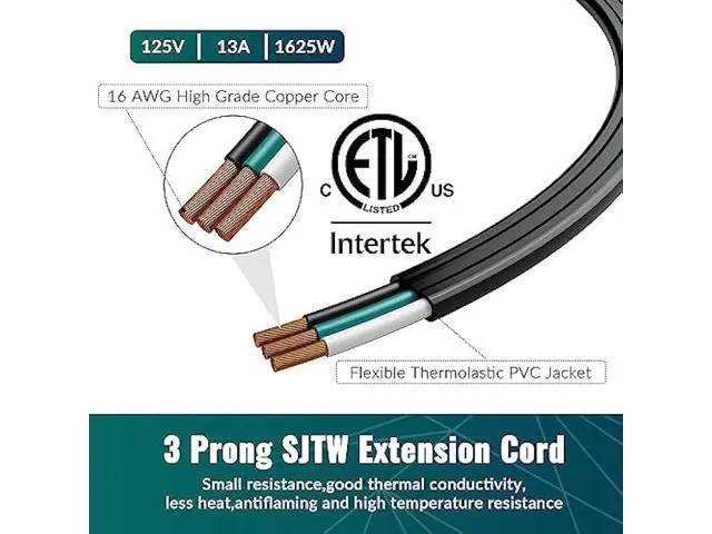 • ¡¾High Quality¡¿ETL Certified Extension Cord, 13Amp 125Volt, 1625 Watts, 3-pronged, grounded plug for safety and convenience, (NEMA 5-15P) to (NEMA 5-15R) , crafted with a PVC jacket, 16-gauge copper conductors for a flat outlet extension cord that will last you for years to come.