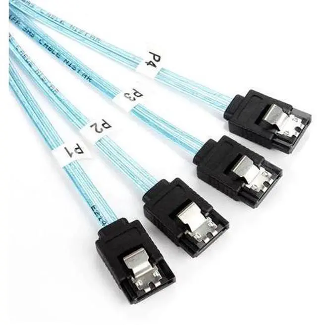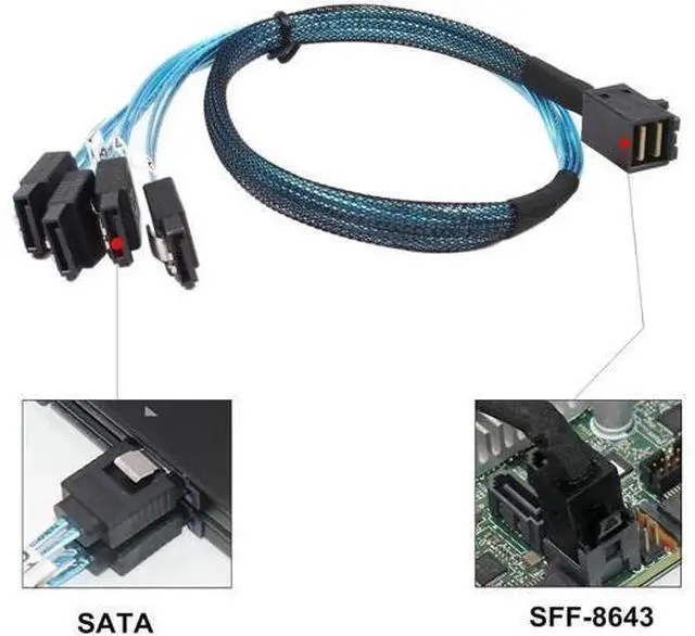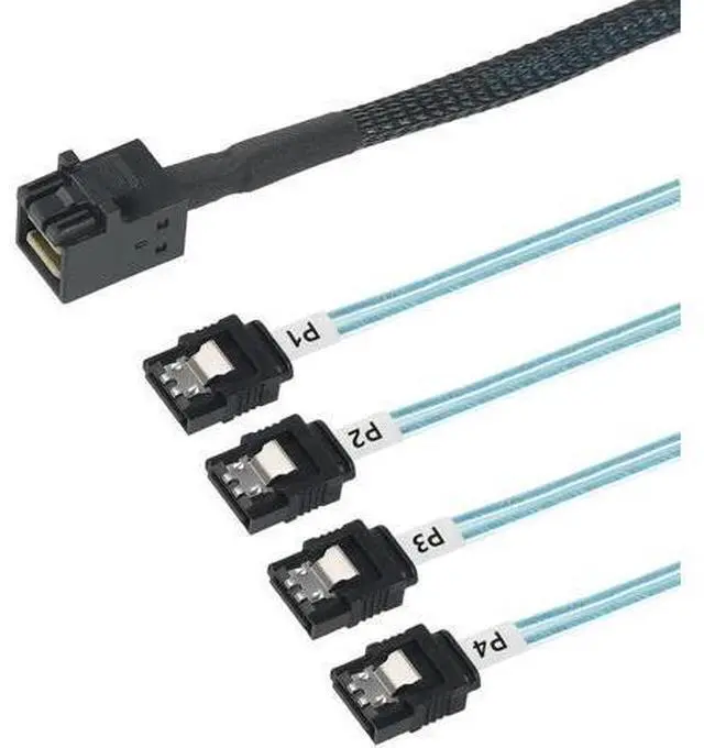 designed to connect a 12 Gbps host bus adapter or RAID controller with SFF-8643 to 4 discrete SATA drives; Mini SAS HD to SATA adapter cable provides reliable internal connectivity between a high density RAID controller card and direct attached storage devices with a SATA plug 36 pin SFF 8643 connector and 4 x 7 pin SATA connectors provides both 3 Gbps and 6 Gbps compatibility while migrating to a to 12 Gbps storage area network system HD mini SAS breakout cable designed with acetate cloth tape over slim ribbon cables for strain relief to protect cables without rigidity; Woven mesh sheath covers half of the cable for easy routing; P1 to P4 markers provide easy ID after installation; Low profile SATA connectors have easy-grip treads with stainless steel latches to prevent accidental disconnection and reduce vibratio Before you buy this cable, please make sure the Mini SAS (SFF-8643) on your motherboard or RAID Controller.