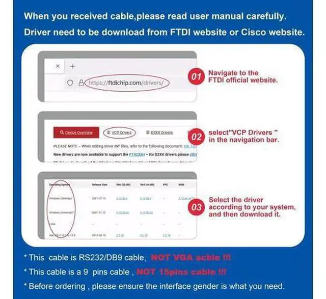 Please NOTE: this is MALE RS232 to DB9 SERIAL CABLE Not VGA!!! It is 9 pin NOT 15 pin!! Look carefully of the Pin is match with your device. Before ordering please confirm the interface gender is waht you need. After receiving please read user manual /instruction at first and download the Driver at first from FT232 Official website or Cisco website. Customer service always online.