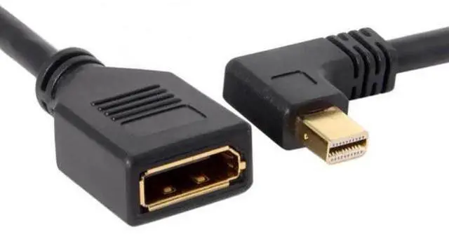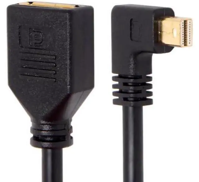 Mini DP DisplayPort 90 Degree to DisplayPort Female Cable for Displays Monitors 90 degree left angled displayport male connector Our mini Displayport to Female Displayport adapter is the perfect solution for hooking up your PC or mini Displayport equipped computer to an Display. Support conversion from DisplayPort Male to HDMI female Supports 20pin DisplayPort interface Support the video Bandwidth up to 10.8G pbs Support the one lane, one direction, four-line connection Support the 1Mbps' bidirectional auxiliary channel Supports highest video resolution QXGA 2560*1600