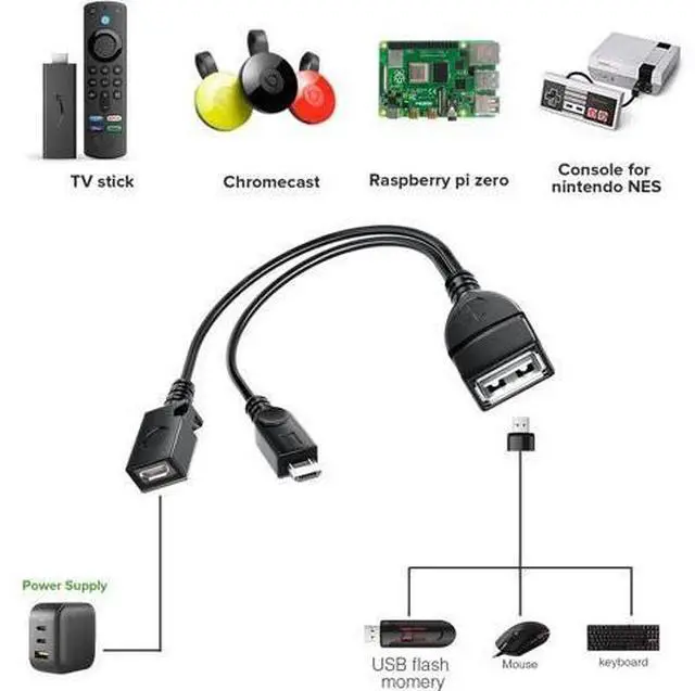 ? NOTEWill not charge phones or tablets. If used on a mobile phone it only supports the OTG function.? ApplicableAdd peripherals to your fire TV stick 4K or host device. As USB flash drives Format must be FAT32 keyboards mouse external hard drives USB card readers USB ethernet adapter game controllers.? AdvantageMicro female port provide power for USB peripherals. Make sure your device's battery will not run out as quickly as other ordinary OTG cables.?
