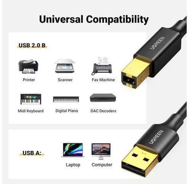 Ideal Printer Scanner Cable: UGREEN USB 2.0 printer cable is ideal for connecting your scanner printer server hard drive camera piano and other USB b devices to a laptop computer (Mac/PC) or other USB-enabled devices for data transfer.
