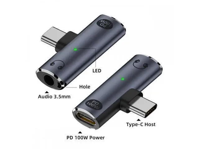 1pc adapter in the package. USB-C Type-C to 3.5 mm Audio DAC AUX Music 100W PD Power Adapter for Laptop Tablet Phone The 3.5 mm audio and power can work at same time. You can transfer audio data and charge the laptop/tablet/phone simultaneously. The angled type Allowing you to connect it to a female port, even if space around the port is limited. Reversible Design for Type C connector, Reversible plug orientation Cable direction. USB-C Sound Card Adapter Enable USB connectivity with your existing 3.5 mm audio headphones, headset, speakers, or microphone.