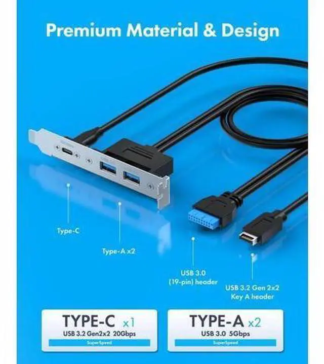 About this item 20Gbps High SpeedConstructed with extremely high speed wires that supports USB-C USB 3.2 Gen 2x2 20Gbps / USB 3.0 Type-A 5Gbps, also backward-compatible with USB 2.0 (The Type-c standard cable is inherently able to operate at both USB Type-C Gen 2 10Gbps and Gen 2x2 20Gbps speeds. The 20Gbps specialized port is required on the device to meet the full 20Gbps transfer speed) Wide CompatibilityPanel-mounted USB-C and USB female connector enables you to connect all USB ready devices such as phones, tablets, flash drives, mouse, hubs, and other USB-C peripherals ConvenienceEasy installation and huge expansion for your PC casing.