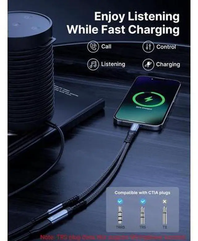 [Note: It may not support QC for some new phones. Suggest using PD wall charger to get faster charging speed]Hi-Fi Audio PlayingThe USB C to 3.5 aux adapter features a Smart DAC chip. All ensures stable high-quality audio transmission and no current noise won' t hurt your ears. The 3.5 mm female port compatible with CTIA.