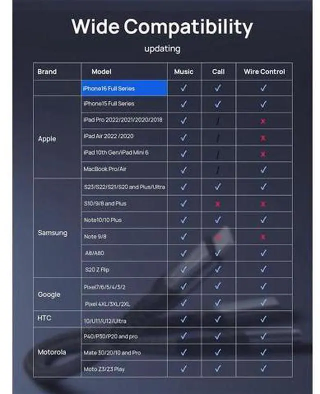 USB/Type c devices: iPhone 16 Pro / iPhone 16 Pro Max / iPhone 16 / iPhone 16 Plus/ iPhone 15/15 Pro/15 Plus/15 Pro Max Galaxy S24/S24+/S24 Ultra/S23/S23 Ultra/S23+/S22/S22 Ultra/S22+/S21/S21 Ultra/S21+ iPad pro2021 iPad mini 6 Macbook Google Pixel 7/6/5/4/4 XL/3/3 XL/2/2 XL and more.