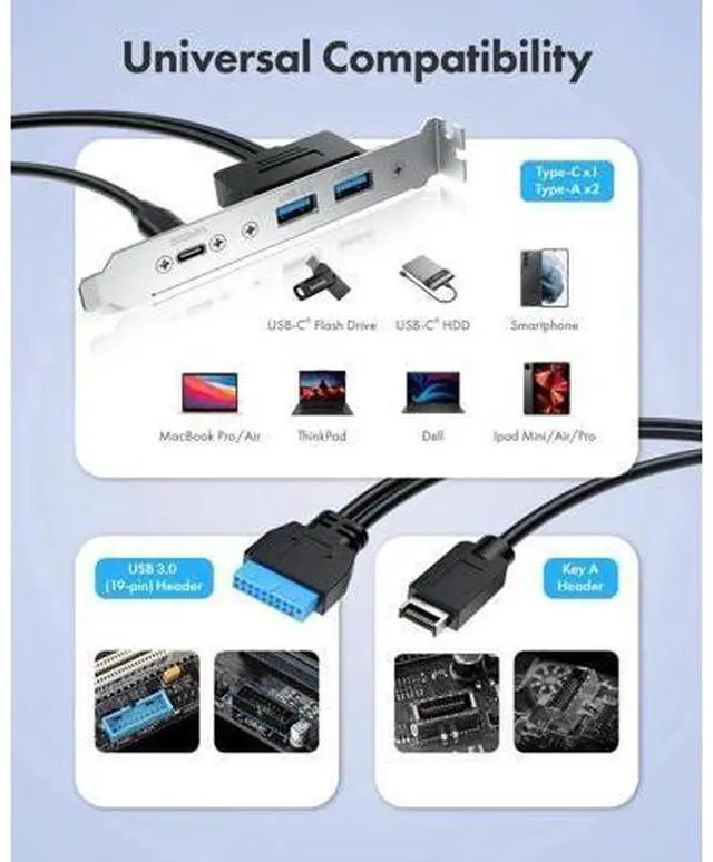 Quickly adds ports through available Type-E and USB 3.0 slot on motherboard for connecting a variety of external USB devices. Fully plug and play and no driver required (Make sure that your motherboard have both headers before buying, some old motherboards do not have 20-pin USB 3.2 Key-A Type-E header and would suggest to install with an USB Front Panel Adapter which converts USB 3.0 header into a USB 3.2 Type-E Key-A 20-Pin connector or a Type-E PCIe Card which converts PCIe slot into a USB 3.2 Type-E connector) Stability and SafetySturdy metal construction ensures a long service life and durability, and fully double shielded EMI/EFI wires to prevent noise interference internally and externally Package ContentsUSB Type-E to Type-C and Type-A extension cable with PCI bracket USB 3.2 Gen 2x2 Type-C and USB 3.0 Front Panel Header Extension Cable with PCI Bracket extension cable is designed to provide your an easy way to convert the motherboard's USB 3.2 TYPE-E and USB 3.0 interface to USB-C and USB Type-A ports on the back of the computer case.