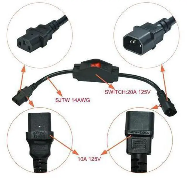 Adapter Cable: Which comes with a switch that allows for easier circuit control. Convert your C14 power cord to 3 Pole IEC 320 C13 female port without extra cable UL SJTW 3/C 14AWG 42CM length Cord rated @ 10A 125V Black Color Connectors 1 (IEC 320 C14) IEC 3Pole male power jack Cord switch DPST Rocker switch 20A 125V AC with red led Connectors 2 IEC-320-C13) female IEC 3 Pole with switch power quick connect disconnect jack. Black 3 Prong Extension Cord with Waterproof Switch, 14AWG Heavy Duty Short Ex... Flat Plug Extension Cord with ON Off Waterproof Switch, 16AWG Right-Angle NEMA... FILSHU 3-Prong Extension Cord, 1625w Heavy Duty Short Extension Cable with On... White Angled Plug Heavy Duty On/Off Switch Extension Cord, 16-AWG Household Pl... FILSHU PDU UPS Male to Female Power Extension Cord Cable, 10A125VAC IEC320 C14... Customer Reviews Price no data cable length 1.3FT 1.3FT 1.3FT 1.3FT 1.3FT Switch Rating 30A 10A 30A 10A 10A voltage 125 volts 125 volts 125 volts 125 volts 125 volts is ul listed????? gauge 14 16 14 16 18 input current 15A 10A 15A 10A 10A Specification IEC 320 C14 to C13 Extension cord with on-off switch 42CM length UL SJTW 3/C 14AWG( 2.08 mm2) Cord rated @ 10A 125V