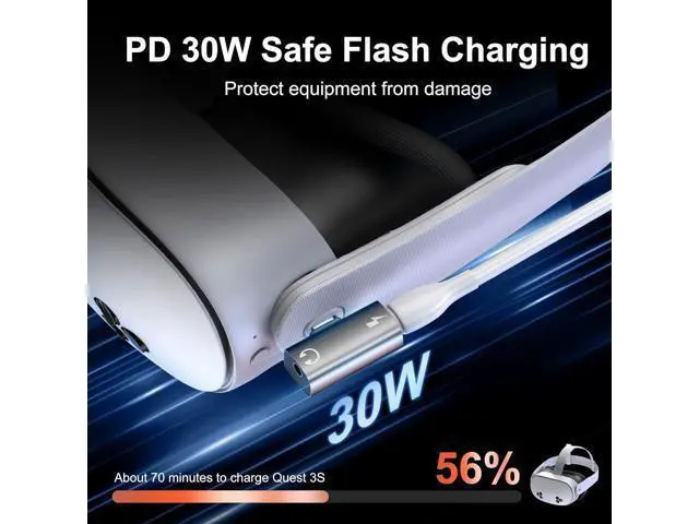 Flash Charging: Supports 30W PD fast charging providing safe and efficient power transmission to protect your device. Charge your Quest 3S up to 56% in just 70 minutes.