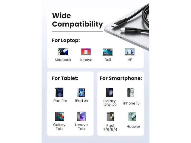 • Compatible Devices Compatible with USB-C devices, such as smartphones(iPhone 16/16 Plus/16 Pro/16 ProMax/15, Galaxy S24/S23/S22/ S21/S20/S10/S9/S8, Galaxy Note20/10/9/8, Galaxy A50/A70/A51/A71, Galaxy Fold/Z Fold2/Z Fold3/Z Fold4, Motorola Moto G seires, Moto One seires, Moto Edge series, Moto Razr series, Pixel 8/7/7 Pro/6/6 Pro/5/4/3, OnePlus 10/9/8/Nord, etc), laptops(Macbook Air/Pro 2020, Dell XPS 13/15, HP Spectre x360/Envy, Lenovo ThinkPad, ASUS ZenBook 14, Surface Laptop), tablets(iPad Air 4/mini 6/Pro 2021, Galaxy Tab A9+/S8/S7, Surface Pro, Lenovo Yoga Tab); and other devices like Nintendo Switch, Steam Deck, Fitbit Versa3/4, GoPro HERO 10, USB-C power bankCompatible with USB-C devices, such as smartphones(iPhone 16/16 Plus/16 Pro/16 ProMax/15, Galaxy S24/S23/S22/ S21/S20/S10/S9/S8, Galaxy Note20/10/9/8, Galaxy A50/A70/A51/A71, Galaxy Fold/Z Fold2/Z Fold3
