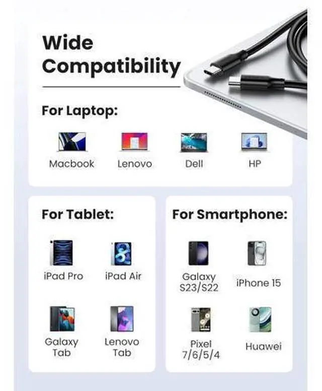 • Compatible Devices Compatible with USB-C devices, such as smartphones(iPhone 16/16 Plus/16 Pro/16 ProMax/15, Galaxy S24/S23/S22/ S21/S20/S10/S9/S8, Galaxy Note20/10/9/8, Galaxy A50/A70/A51/A71, Galaxy Fold/Z Fold2/Z Fold3/Z Fold4, Motorola Moto G seires, Moto One seires, Moto Edge series, Moto Razr series, Pixel 8/7/7 Pro/6/6 Pro/5/4/3, OnePlus 10/9/8/Nord, etc), laptops(Macbook Air/Pro 2020, Dell XPS 13/15, HP Spectre x360/Envy, Lenovo ThinkPad, ASUS ZenBook 14, Surface Laptop), tablets(iPad Air 4/mini 6/Pro 2021, Galaxy Tab A9+/S8/S7, Surface Pro, Lenovo Yoga Tab); and other devices like Nintendo Switch, Steam Deck, Fitbit Versa3/4, GoPro HERO 10, USB-C power bankCompatible with USB-C devices, such as smartphones(iPhone 16/16 Plus/16 Pro/16 ProMax/15, Galaxy S24/S23/S22/ S21/S20/S10/S9/S8, Galaxy Note20/10/9/8, Galaxy A50/A70/A51/A71, Galaxy Fold/Z Fold2/Z Fold3