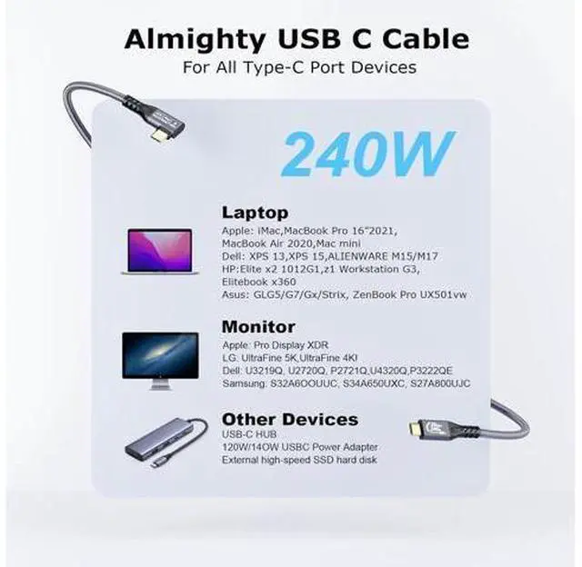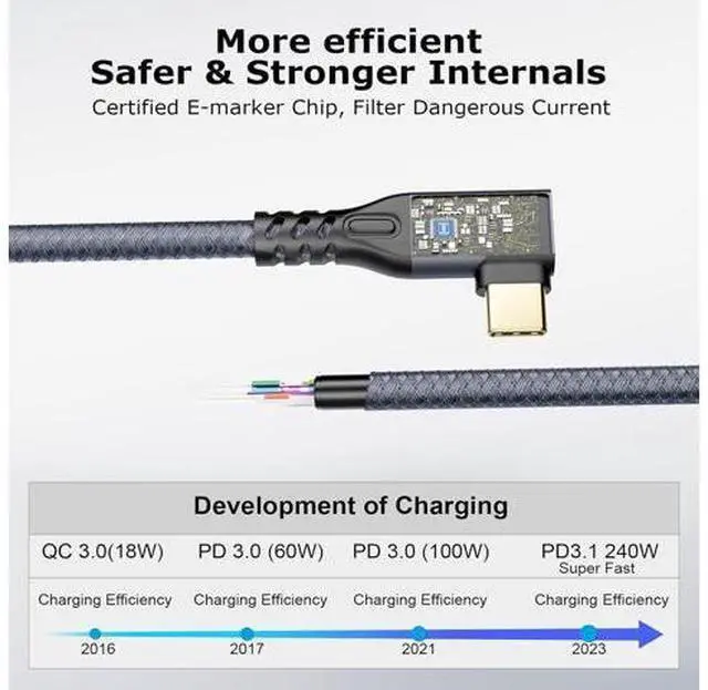 • 240W PD E-Mark ProtectionThe USBC charger cord supports PD 3.1 and QC4.0 fast charging, up to 50V/5A(max) with USB-C Power Delivery adapters, including various USB-C wall adapters 240W 100W 96W 87W 61W 60W 30W 18W 15W. Integrating the best E-Mark chip, which supports USB PD fast charging and ensures full battery protection of devices and adapters, it is fully backward compatible with PD 3.0/2.0, QC3.0/2.0 and 's adaptive fast charging, which allows you to charge at low speed safely.