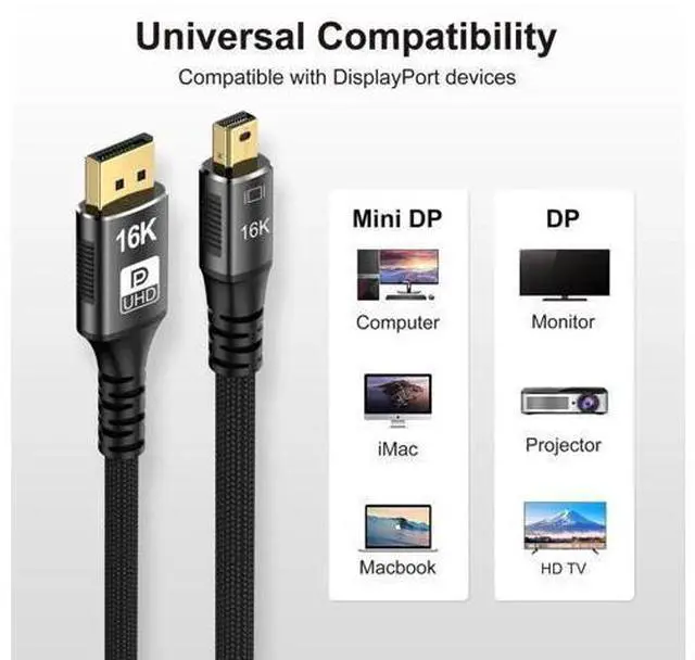 • 2) 16K@60Hz Video: 16K MiniDisplay Port cable 2.1 supports 16K@60Hz with DSC, 10K@60Hz, 8K@120/60Hz, 4K@240/165/144Hz, 2K@240/165/120Hz , ensuring high quality content transmission and lossless audio output.
