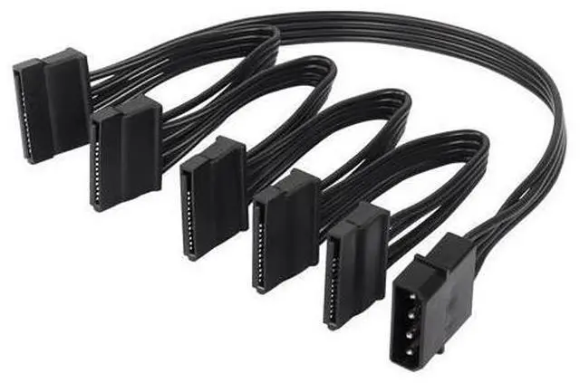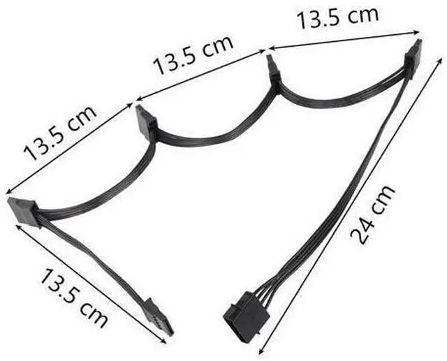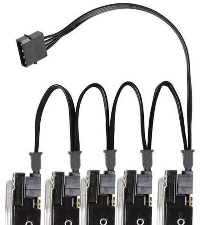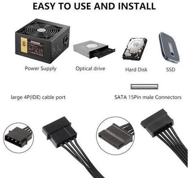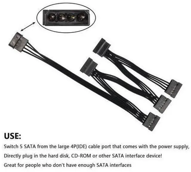 SATA POWER SPLITTER4 Pin IDE to 5 SATA 15 pin splitter cable, add five extra SATA power sockets for your power supply, attach the drive 4 Pin IDE power cord into the power supply, provide a safe connection. IDE to SATA EXTENSION CABLE4 Pin IDE to 5 SATA power splitter cable with length 24cm+ 13.5 cm+ 13.5 cm+ 13.5 cm+ 13.5 cm, much convenient for the connection between HDD SSD and your computer. MORE DURABLEUse high-quality wire, easy to bend, strong toughness and wear resistance. The interface is designed according to the standard, and it is easy to plug and unplug.