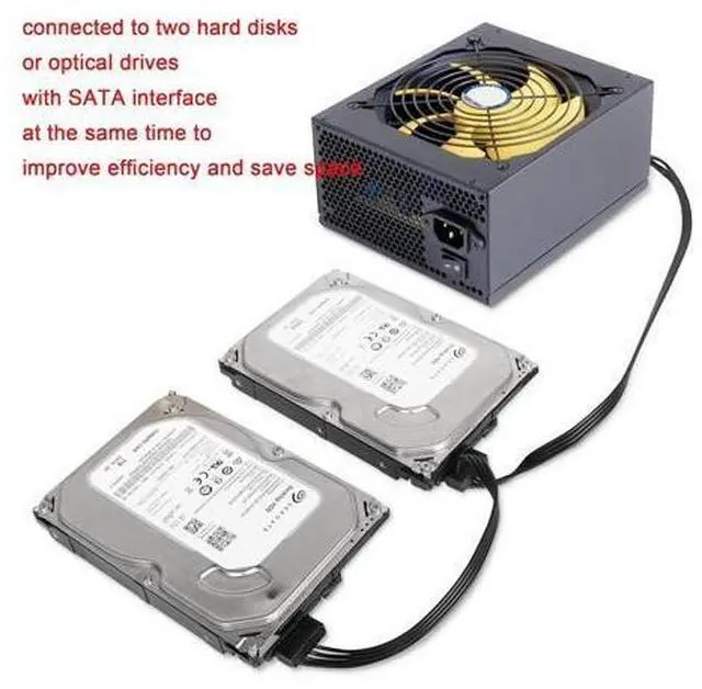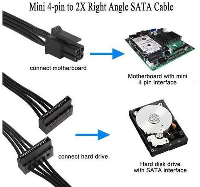 Mini 4P to 2x Right-Angle SATAIt adopts one-to-two output mode, which can be connected to two hard disks or optical drives with SATA interface at the same time to improve efficiency and save space. Mini 4 Pin port plugs into specific brand computer motherboard (NOTE: It is mini 4 pin port, not standard 4 pin port. ), Right-angle 15 Pin SATA port plugs into the hard drive.