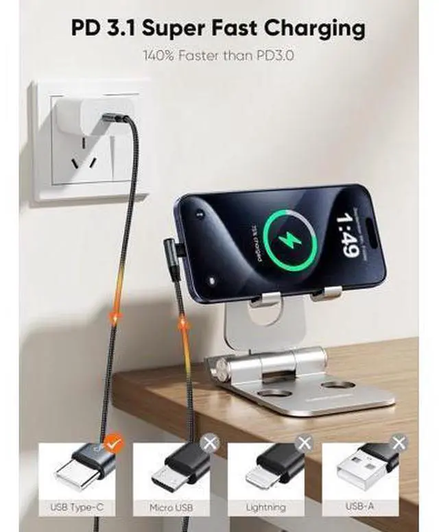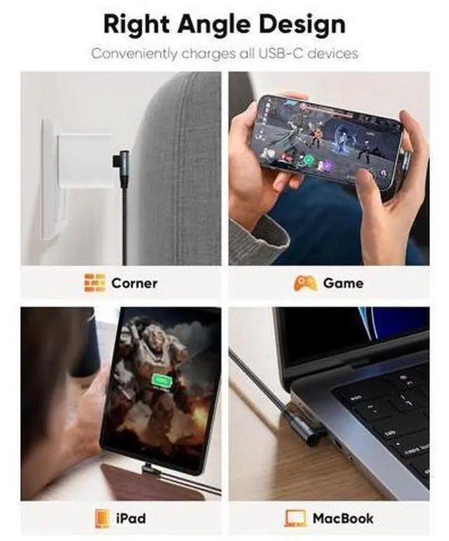 • [ Exclusive Right-Angle Design]: This 240w right-angle USB-C cable with an innovative 90-degree "L" shape. Its user-friendly design is more convenient and comfortable for playing games, watching videos, and reading e-books when the phone is charging.