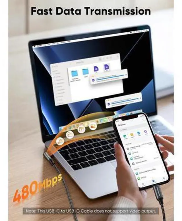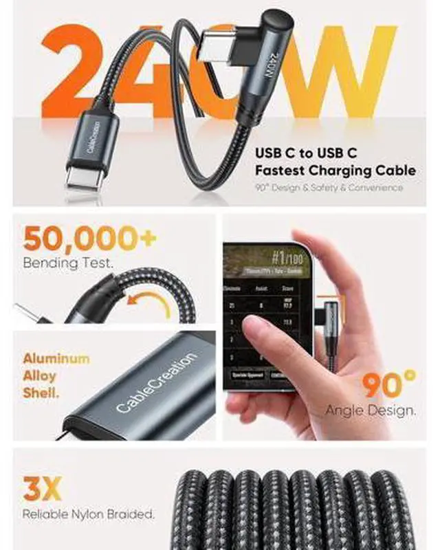 [ -Notes- ]: 1. This Type-C to Type-C cable supports Thunderbolt 3/4 ports. 2. It can be used as an iPhone 15 charger cable, but not for iPhones with a lightning port, not support video output. 3. This is USB 2.0 C Cord, not a USB 3. X Cable. CableCreation 240W USB C to USB C Fast Charge Cable, Newest Angled "L" Shape This is a USB C 2.0 Cable, not a USB 3. X cable. It supports PD 3.1 Fast Charge, compatible with Thunderbolt 3/4 ports. Support 48V/5A Fast Charging Support PD 3.0 /QC 3.0 /QC 4.0 fast charging up to 240W Max, also compatible with 140W/100W/65W/60W/45W/35W/25W all Type-C port devices. 240W USB C Safe E-marker chip Upgrade 240W Smart E-Mark Chip Intelligently matches the required current, protects devices' battery and adapters, gives you a faster, more stable, and safer charging environment. 50, 000+Bending Tests 10X Military Grade Durability Nylon braided cords that have passed 50, 000+ bend tests, not easy to break. Comfortable touch and flexible for charging. 480Mbps Support 480Mbps Data Transfer Support high-speed data sync up to 40-60MB/S (480Mbps), but do not support video output.