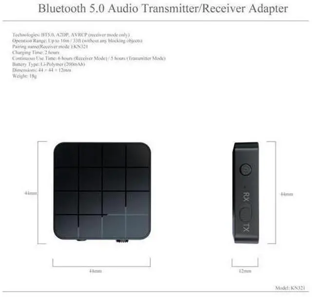 How to use: 1) Plug one end of the audio cable into the audio output of the devices and the other end into the audio of the KN321. 2) Confirm that it is in TX mode (red light flash). The KN321 will automatically search for Bluetooth headset or Bluetooth speaker pairing.