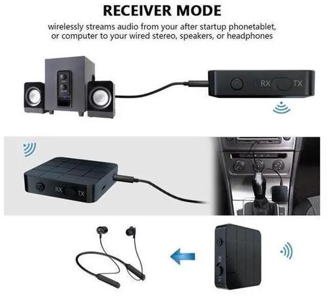 Receiver mode: wirelessly streams audio from your Bluetooth-enabled phone, tablet, or computer to your wired stereo, speakers, or headphones;