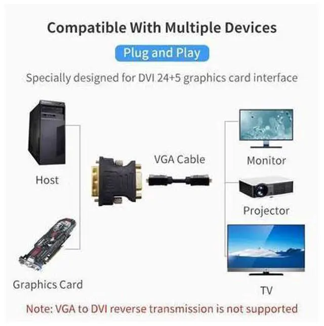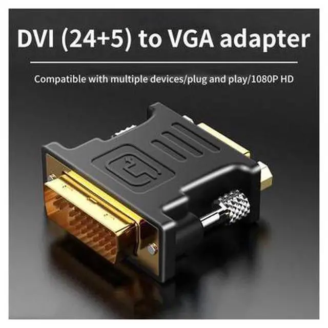 • The DVI to VGA adapter can only convert from DVI to VGA signals. DVI-I 24 + 5 male to VGA female connect your desktop, laptop, graphics card with a VGA equipped HDTV, monitor, projector.
