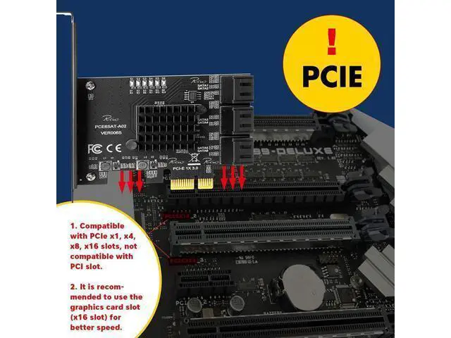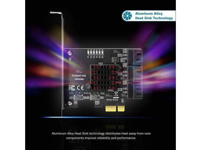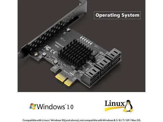 Features Chipset: Asmedia1064 Support 4 SATA 3.0 6Gbps devices Compliant with PCI-Express Specification v 2.0, v 3.0, backwards compatible with PCIe 1.0 Compliant with Serial ATA Specification 3.0, backwards compliant with Serial ATA 2.0, Serial ATA 1.0 Supports Communication Speeds of 6.0 Gbps, 3.0 Gbps, and 1.5 Gbps Supports Port Multiplier FIS-based and Command-based switching Plug and play, supports Hot Plug and Hot Swap Installation Notes If it is not recognized, please replace a PCIe slot, or try updating the motherboard BIOS. If it is not recognized, please try to install the driver. Compatibility issues may occur due to the different motherboard environments in which it is installed. It is forbidden to install in the PCI slot