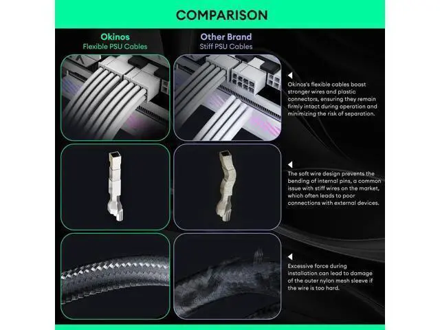 [Easily-flexed Soft Texture]With its soft texture, the PSU cables easily caters to diverse route requirements while also providing durability against PSU cables breakage and sleeve detachment during unplugging. [Flexible Cable for Internal Pin Protection]With standing external pressure during use, the flexibility of the cable extension ensures that the contact pin inside the sleeve remains unaffected, preventing bending and guaranteeing stable and secure power supply. [Premium Nylon Sleeved Cables]Featuring premium nylon, PSU cable extensions provide flexibility to resist friction, extending longevity, while possessing excellent tensile strength. This enables the PSU cable to withstand tension without breaking easily, ensuring stable transmission.