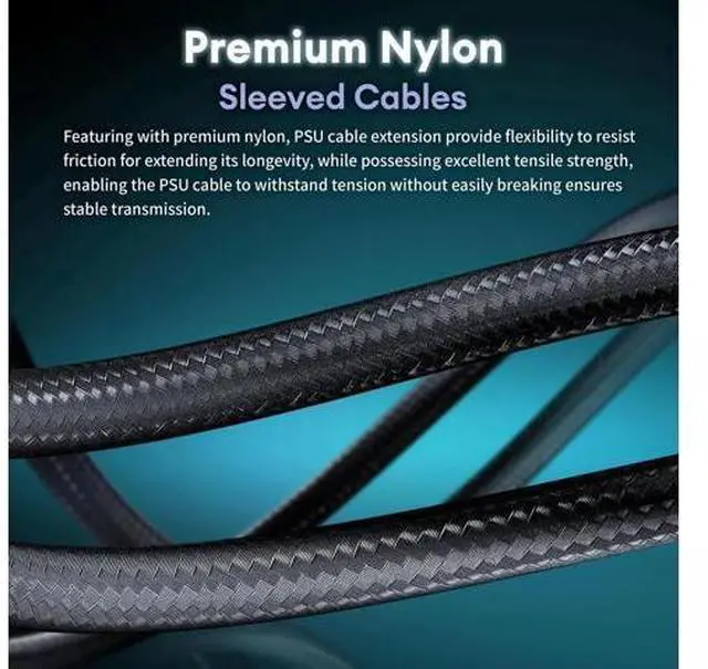 • [Premium Nylon Sleeved Cables]Featuring premium nylon, PSU cable extensions provide flexibility to resist friction, extending longevity, while possessing excellent tensile strength. This enables the PSU cable to withstand tension without breaking easily, ensuring stable transmission.