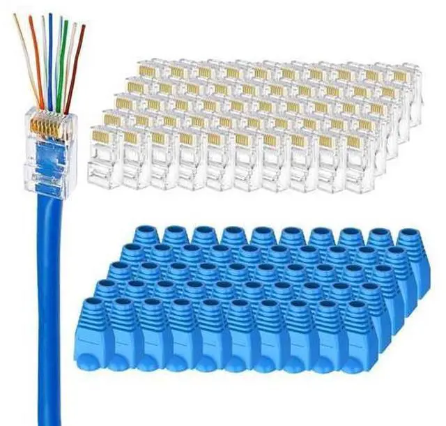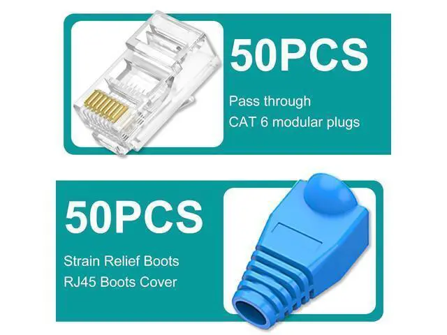 • Cat6 RJ45 Pass Through Connectors: 50-Pack of RJ45 connectors for Cat6 Ethernet cable with 50-pack strain relief boots